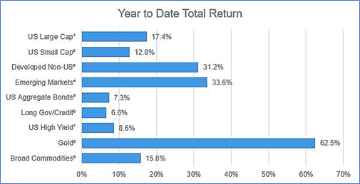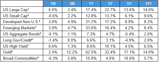 U.S. stocks traded sideways in December before fading into year-end. Large caps managed to end flat while smaller companies traded lower, declining by 0.6% for the month. Meanwhile, non-U.S. stocks finished with a flourish, gaining 3% in December. Emerging markets took home the title of top performing equity market for 2025, with a total return of 33.6%, while developed international stocks were a close second, booking a gain of 31.2% for the year.