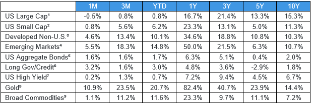 U.S. stocks lagged and interest rates fell during an uneven month marketed by shifting market sentiment, rising geopolitical risk, and continued murkiness on domestic trade policy. Interest rates fell, giving bonds a boost, and international equities continued to shine. The cost and consequence of the AI buildout swayed U.S. markets throughout the month with high projected CAPEX denting hyperscaler stocks, while enterprise software companies were scrutinized by investors seeking to identify possible AI casualties.