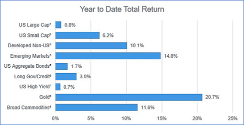 1 – Russell 1000, 2 – Russell 2000, 3 – MSCI EAFE, 4 – MSCI Emerging Markets, 5 – Bloomberg US Agg, 6 – Bloomberg US Long Gov/Credit